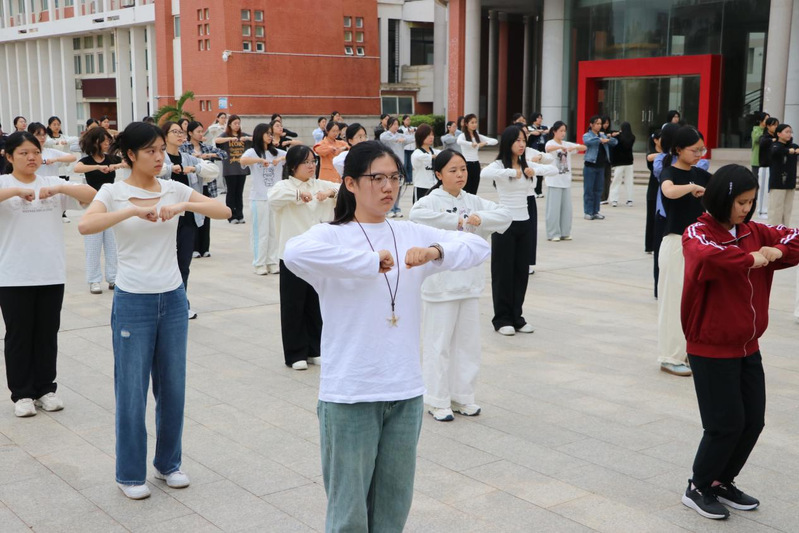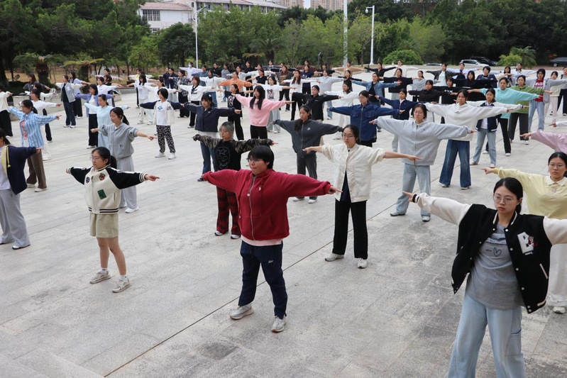 在小教练们的悉心指导下,外院学子们精神抖擞、全神贯注,紧随口号节拍与音乐旋律,反复打磨每一个动作细节。他们整齐的步伐踏响青春韵律,舒展的姿态绽放蓬勃朝气,成为秋日校园里一道鲜活明媚的风景线。
