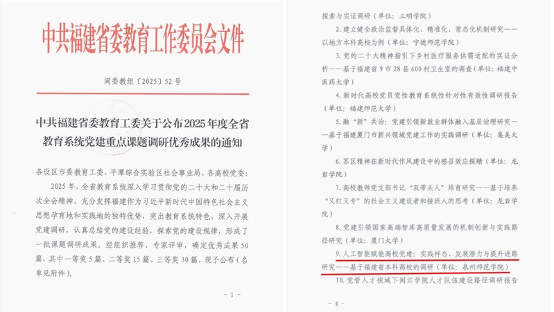 近日,中共福建省委教育工委公布2025年度全省教育系统党建重点课题调研优秀成果我院林伟荦和校党委组织部陈式座的《人工智能赋能高校党建:实践样态、发展潜力与提升进路研究——基于福建省本科高校的调研》荣获二等奖。