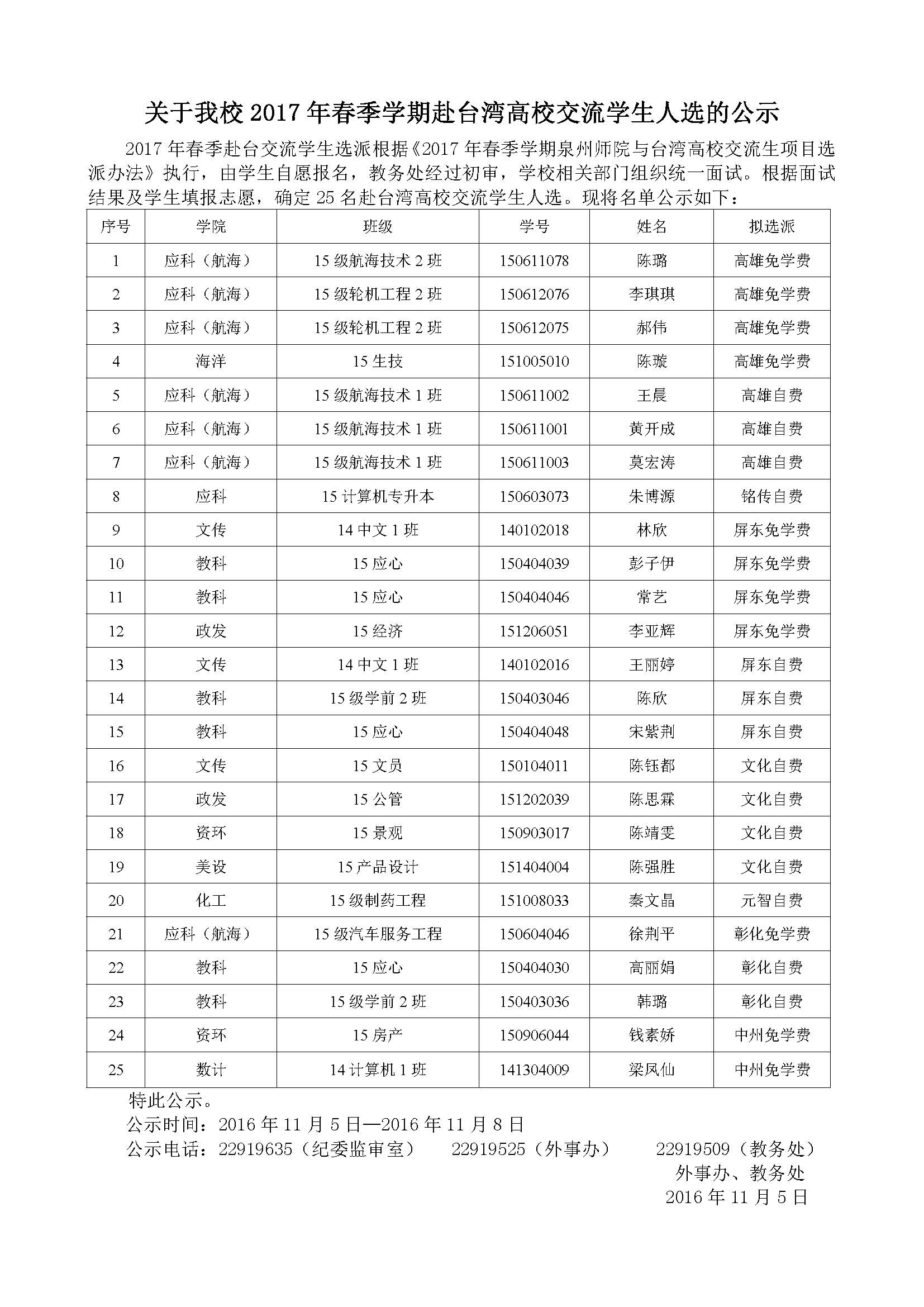 关于我校2017年春季学期赴台湾高校交流学生人选的公示