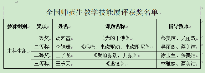 在学院统一部署下,学院领导、指导教师、辅导员与教辅人员深入学生宿舍与实验室,主动关心并服务留校参与学科竞赛及考研复习的学生,选派优秀教师全程指导,为各参赛团队提供有力支持。学院学子先后参加了全国第十六届“格致杯”物理师范生教学技能展评、第十三届全国大学生光电设计竞赛、第十八届全国大学生先进成图技术与产品信息建模创新大赛等多项高水平赛事,表现优异。