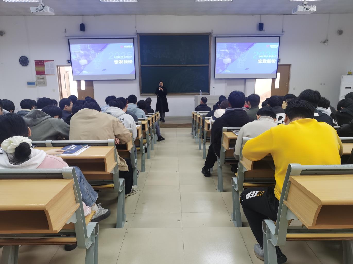 12月26日下午,物理与信息工程学院在理工楼320教室举办宏发集团专场招聘会。学院党委副书记洪荣文、电气工程与智能控制专业主任胡宝法、相关专任教师、全体辅导员及宏发集团企业代表出席,2026届应届毕业生近120人参加。招聘会由洪荣文主持。