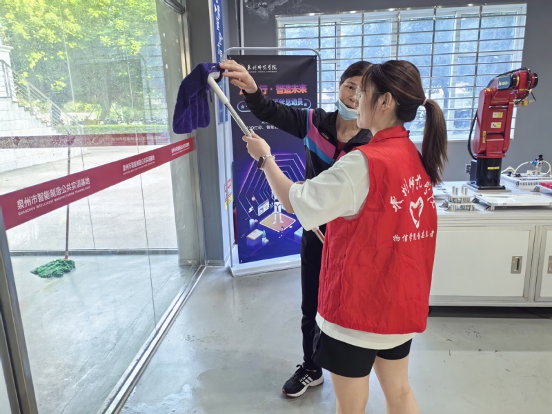 在五一劳动节来临之际,4月29日,物信学院组织30余名学生前往文科类A栋一楼泉州市智能制造公共实训基地,开展“一站式”学生社区劳动教育实践活动。学院办公室副主任朱思参与活动,保洁工作人员现场进行劳动指导。
