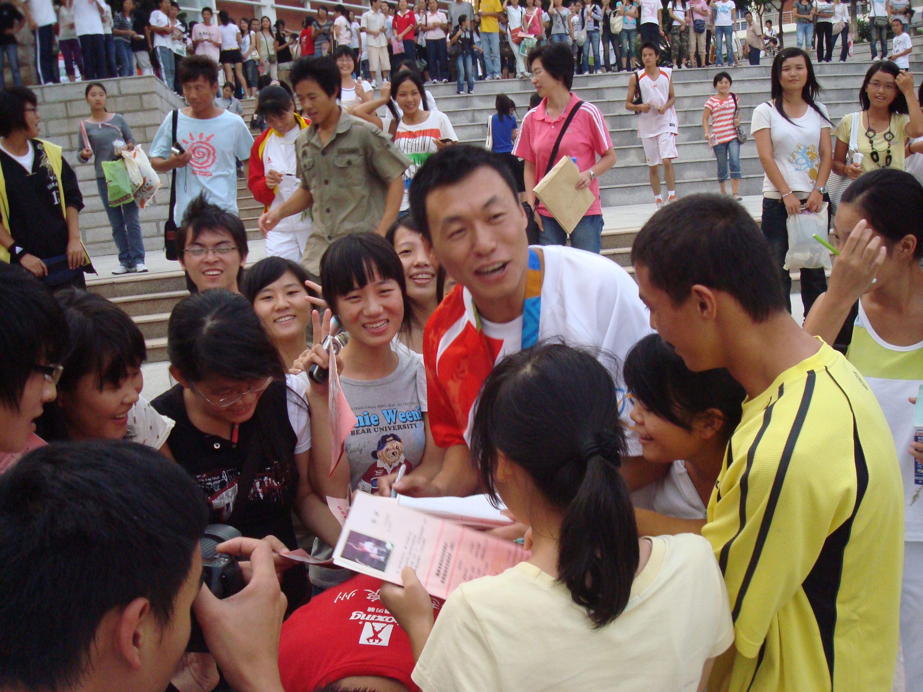 报告会现场气氛热烈,掌声如雷,经久不息。奥运健儿“自强不息、奋力拼搏”的精神深深感染了到场师生,同学们争先向运动员献花。会后,运动员、教练员纷纷给同学们签名,并与到场师生合影留念。(校团委)