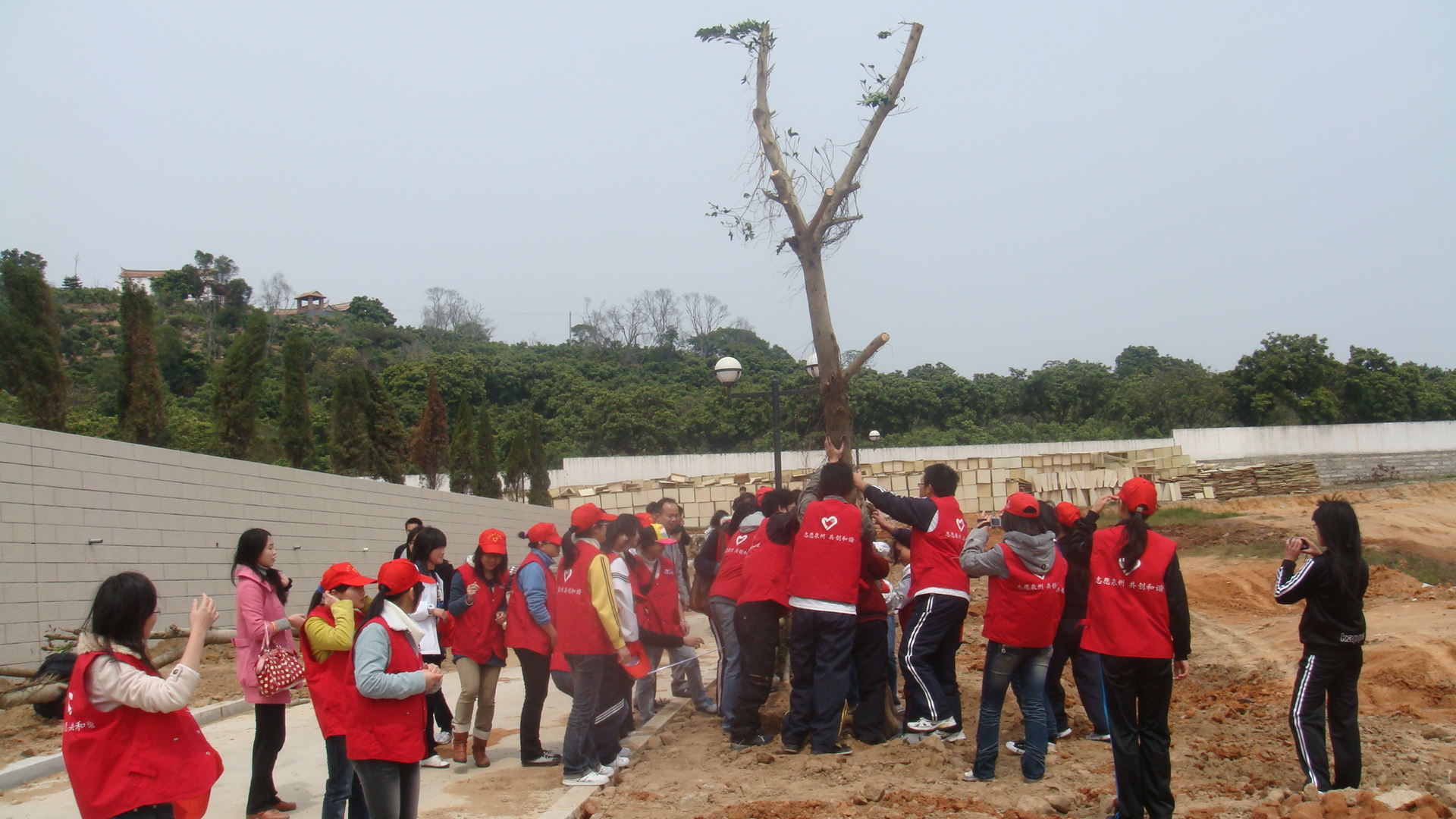 植树现场,一片热火朝天的劳动景象。志愿者在技术人员的指导下,将一棵棵树苗植入刚挖好的树坑,然后铲土填坑、挥锹培土、提水浇灌,经过一番紧张劳动,一排排新栽下的树木昂然挺立,在风和日丽的明媚春光中展现着蓬勃生机。