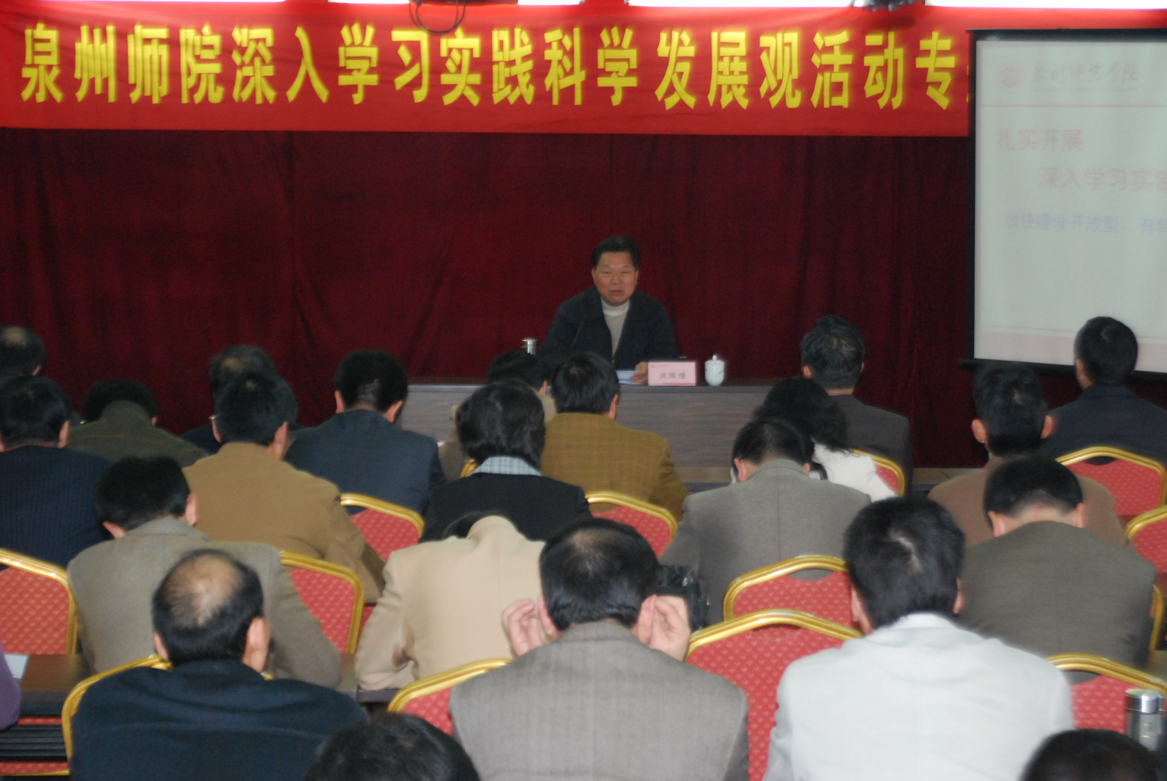 为深入推动学习实践科学发展观活动,全面、准确地理解和把握科学发展观的科学内涵、精神实质和基本要求,4月7日下午,校党委书记洪辉煌作题为《扎实开展深入学习实践科学发展观活动,加快建设开放型、有特色、高水平的地方大学》的辅导报告。校领导黄子杰、张舟、赖新民、王炳庆、林华东、王晓东,学校、各党总支(直属支部)学习实践科学发展观领导小组、办公室、工作小组成员,教授,校团委会、学生会委员共计100多人参加了辅导报告会。