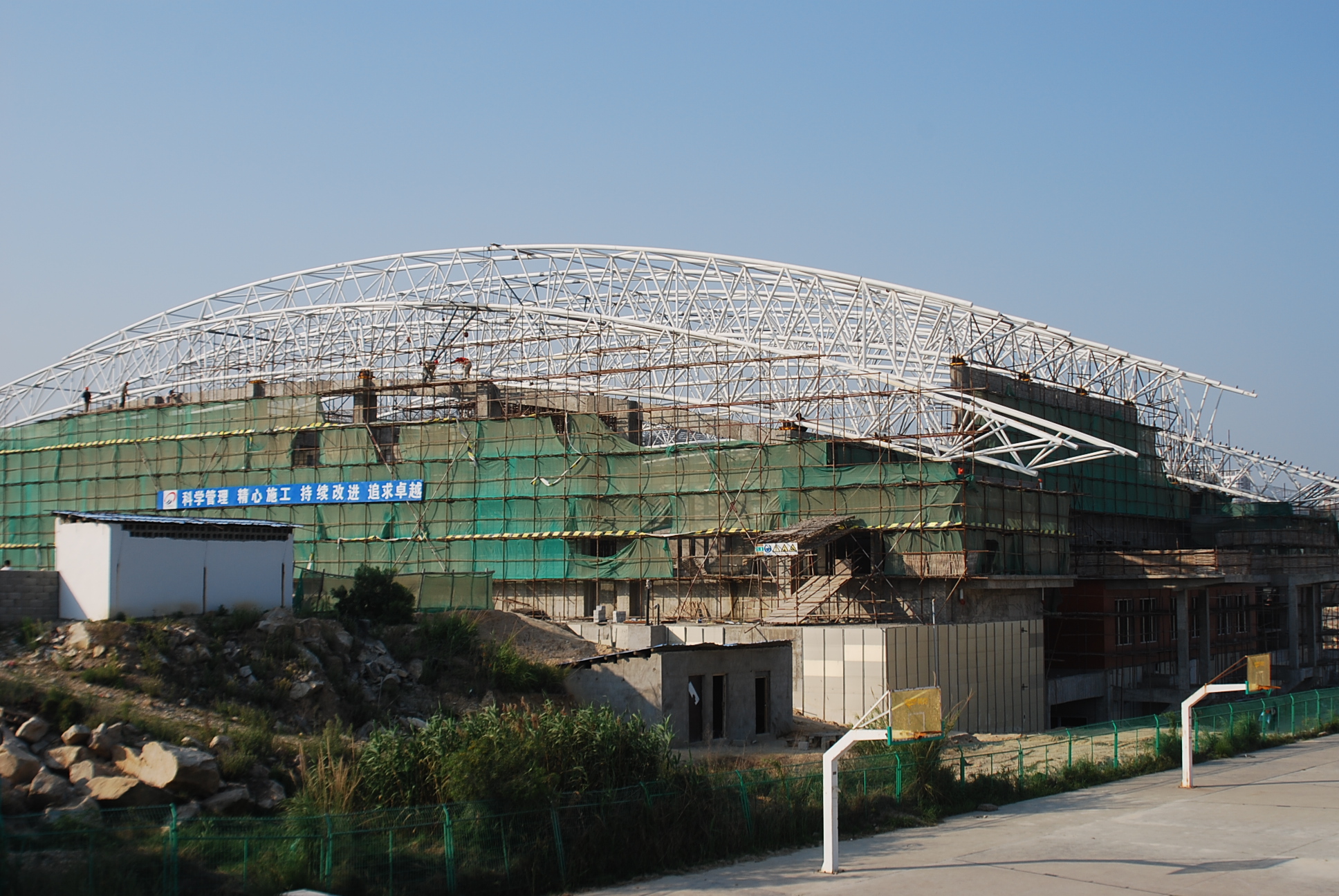 日前,我校明德体育馆完成跨度68.8米的屋面钢桁架吊装。据了解,明德体育馆正在加紧内外装修。地下室装修基本完成,预计年底可以竣工。
