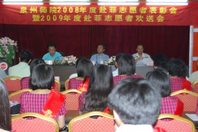 我校自2005年起,就加入了国家汉办的国际汉语教师中国志愿者项目,成为省内最早选派志愿者的三所大学之一。至今,我校已为菲律宾华校输送了103人次的志愿者教师。今后几天,2009年度28名志愿者又即将奔赴菲律宾开展汉语教学工作。我校志愿者在菲律宾期间,发扬了中国志愿者热爱祖国、拼搏敬业的精神,在自己的教学岗位上做出不愧于母校、不愧于祖国的优秀业绩,为推广汉语、弘扬祖国传统文化传统作出了贡献。他们优秀的表现赢得了菲律宾华文教育界、侨界及我驻菲大使馆的充分肯定和赞扬,为学校赢得了很好的声誉。 (外事办 许琦红)