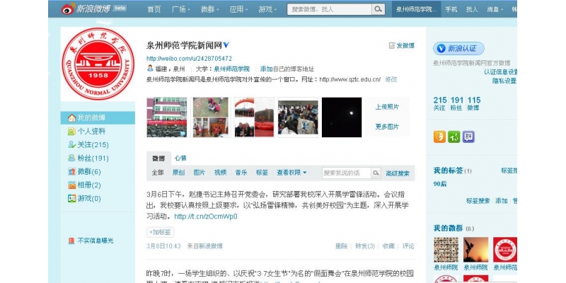 为适应新形势下学校宣传工作的需要,充分利用新兴媒体和现代信息技术,提高我校对内对外宣传效果,扩大学校的社会影响,校党委宣传部于去年年底申请了“泉州师范学院新闻网”微博。试运行期间,微博受到学校师生、校友和许多网友的热烈关注。