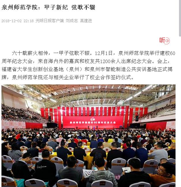 12月1日,泉州师范学院举行建校60周年纪念大会,来自海内外的嘉宾和校友共1200余人出席纪念大会。会上,福建省大学生创新创业基地(泉州)和泉州市智能制造公共实训基地正式揭牌,泉州师范学院还与相关企业举行了校企合作签约仪式。
