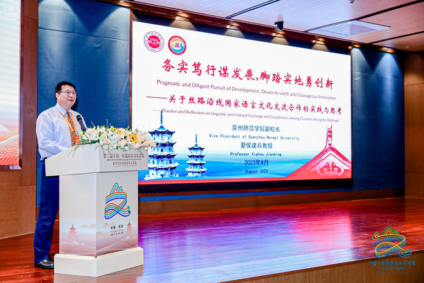 夏侯建兵教授在论坛上作《务实笃行谋发展,脚踏实地勇创新——关于丝路沿线国家语言文化交流合作的实践与思考》的报告分享。报告围绕“丝路沿线国家语言文化交流合作”主题,从开发和建设丝路语言文化数据库矩阵、建立丝路沿线国家语言文化交流高校联盟、持续推进福建汉语方言的保护与传承、促进和加强闽台语言文化交流合作等四个方面,分享我校丝路语言文化研究中心近年来的工作想法和做法,获得与会领导和嘉宾的高度肯定与赞许。