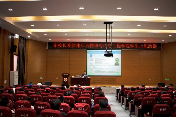 12月12日下午,副校长夏侯建兵以《从第一代中央领导集体形成与毛泽东领袖地位确立及其历史经验谈坚定“两个维护”的意义》为题,为物理与信息工程学院学生代表上思政课。物理与信息工程学院党政负责人、辅导员和学生代表共100多名到场听课。