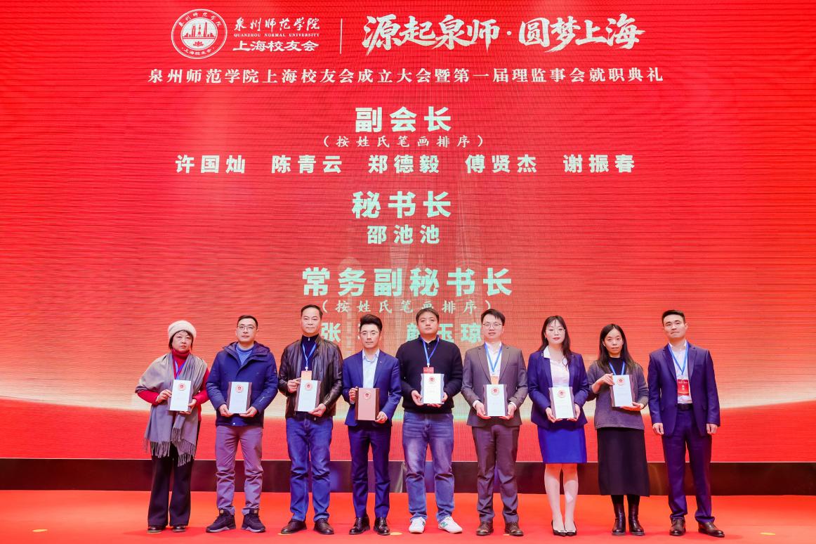 1月25日,泉州师范学院上海校友会在沪正式成立。校长陈昌萍,上海市第十六届人大常委会委员、上海应用技术大学副校长毛祥东,副校长黄江昆,福建省人民政府驻沪办副主任陈木金,泉州市人民政府驻沪联络处主任柯国林,原宁德市副市长薛成康,上海浦东农协会会长周德福,中共寿宁县凤阳镇党委书记李木清,寿宁县下党乡乡长、泉州师范学院校友叶新,原泉州师专校长陈世兴的特别代表陈旭东,泉州师范学院北京校友会会长赖瑞拥、川渝校友会会长苏才木、厦门校友会会长张连机、大湾区校友会(筹)代表李增景,厦门大学上海校友会、南京审计大学上海校友会、福州大学上海校友会、福建师范大学上海校友会、福建农林大学长三角校友会、华侨大学上海校友会、集美大学上海校友会、闽南师范大学江浙沪校友会、福建理工大学上海校友会、莆田学院上海校友会、闽江学院上海校友会、三明学院上海校友会、厦门大学嘉庚学院上海校友会等兄弟高校代表,泉州一中、泉州五中等泉州在沪中学校友会代表,上海福建商会、泉州及各县市驻沪商协会、宁德及其驻沪有关商协会负责人或代表,学校相关职能部门,上海地区校友代表等200余人出席活动,共同见证泉州师范学院上海校友会的成立。