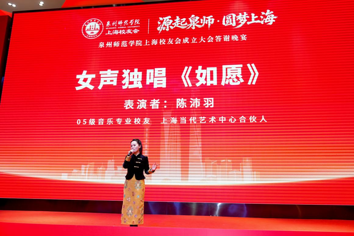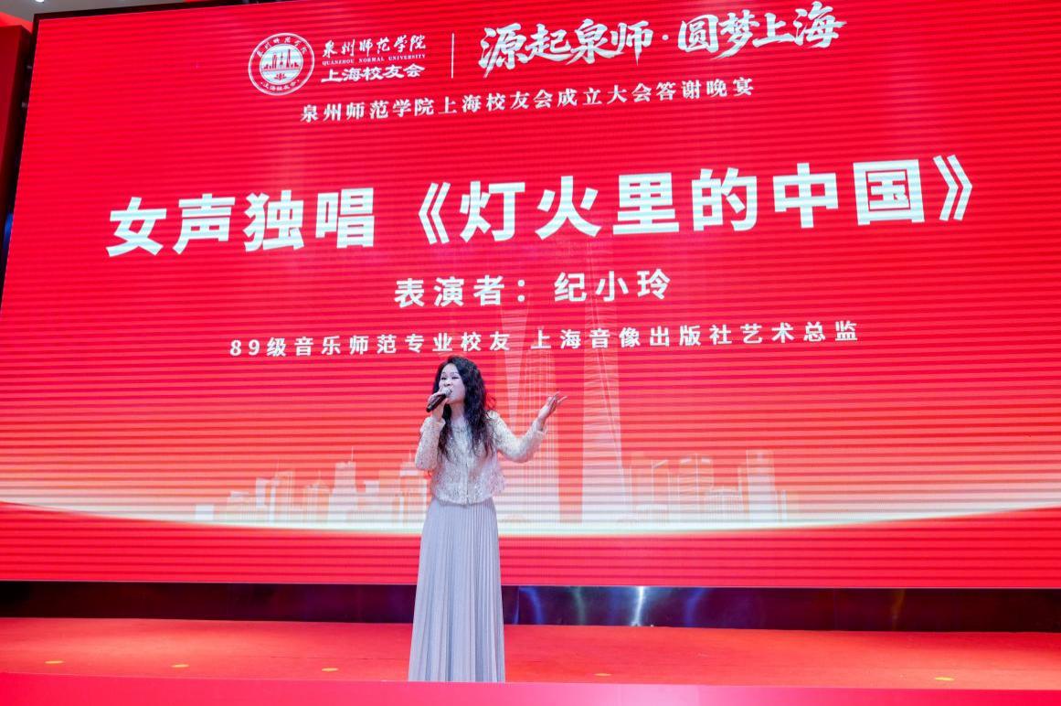 此外,大会现场精彩的校友节目轮番上演,尽显泉师学子的赤子之心与时代风采。校友代表蔡崇达、郭春波、夏铭悦、张玥倾情呈现访谈节目《我与泉师》,娓娓道来他们与母校相伴成长、砥砺奋斗、心怀感恩的动人故事,让在场每一位校友都产生强烈的情感共鸣。校友纪小玲演绎歌曲《灯火里的中国》,陈沛羽带来独唱《如愿》,她们用清澈真挚的歌声,礼赞当下的美好时光,抒发对未来的无限憧憬,更唱出了全体上海校友与母校同心同向、共赴新程的美好心愿。
