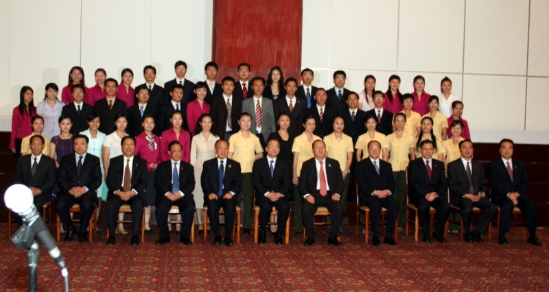 温家宝总理及随行国家部委领导与志愿者合影留念,前排领导由左至右依次为:中国工程院院士“杂交水稻之父”