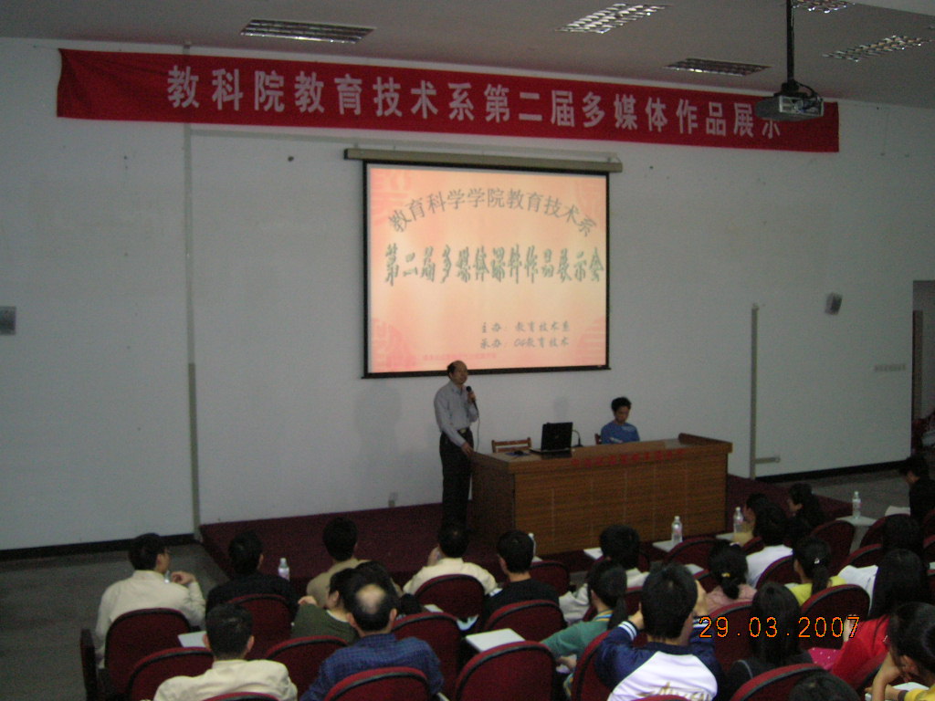 3月29日,教育科学学院在孙中山学术报告厅一楼举行了04教育技术专业承办的第二届多媒体作品展示。参加此次作品展示会的除了教育技术专业的学生外,还有其他各专业的众多同学。