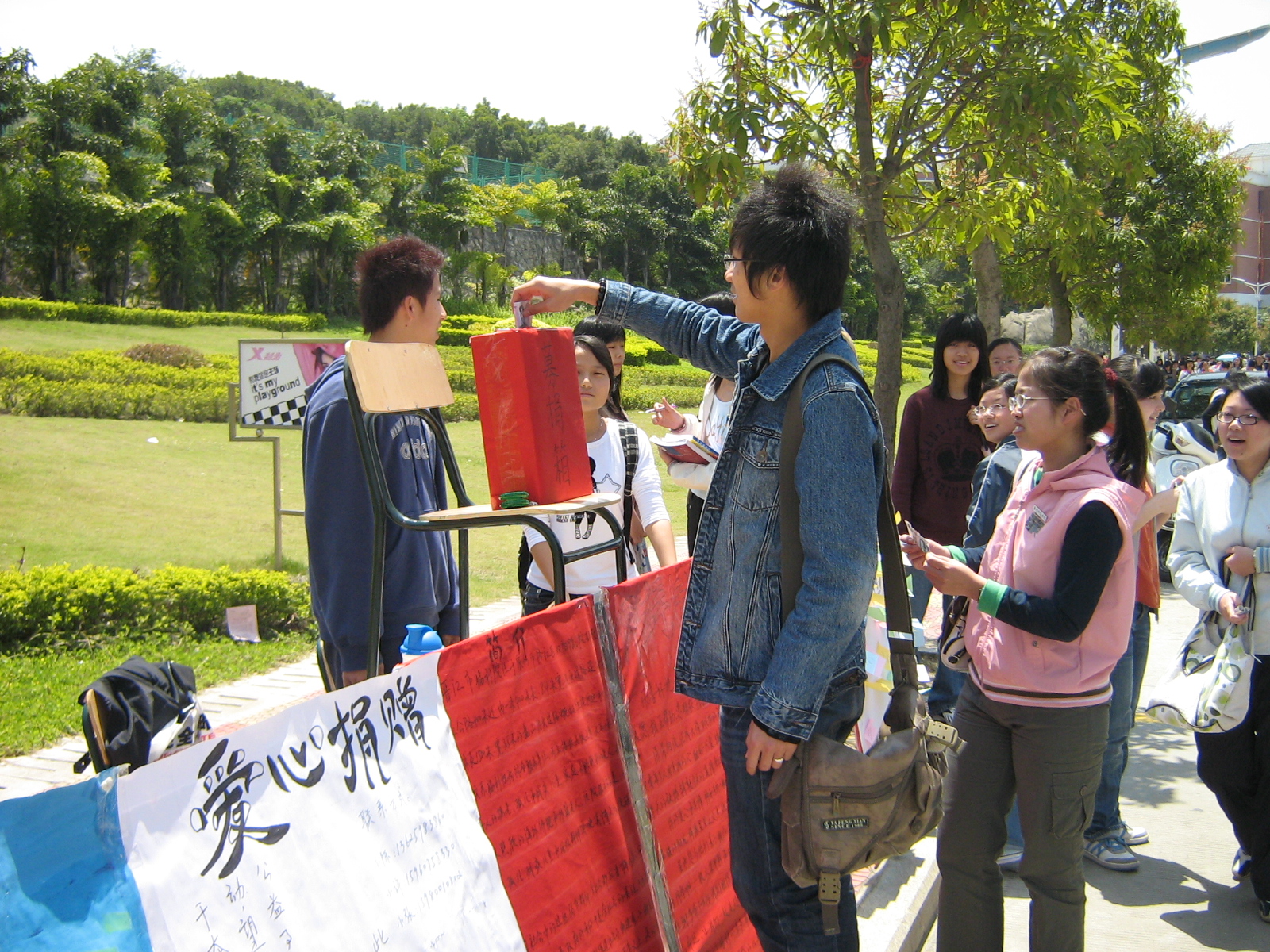 8日,该院组织学生代表前往晋江市福利院,了解生活在那的41名孤、残、障儿童的生活情况,并与他们进行互动小游戏,增进沟通与交流。经实地调查后,在周日的政治学习上,该院组织班级召开主题班会,以福利院的爱心行动感染广大同学,大家纷纷献言献计,踊跃捐款捐物。为能发动更多的人参与到爱心活动中,13日起,该院在校园主干道上张贴宣传海报和留言版,设立募捐箱,该院负责人带头捐款。短短几日,就募集到了救助站和福利院所需的钱、物。