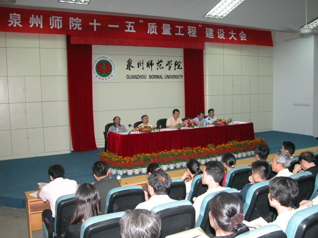 5月31日,我校十一五“质量工程”建设大会在东海校区孙中山纪念堂学术报告厅召开。校领导洪辉煌、张舟、赖新民、王炳庆、林华东以及全校副科级以上干部、副高职称以上教师和辅导员、各二级学院教务科长共300多人参加了会议。校党委书记洪辉煌在会上作重要讲话。会议由副院长林华东主持。