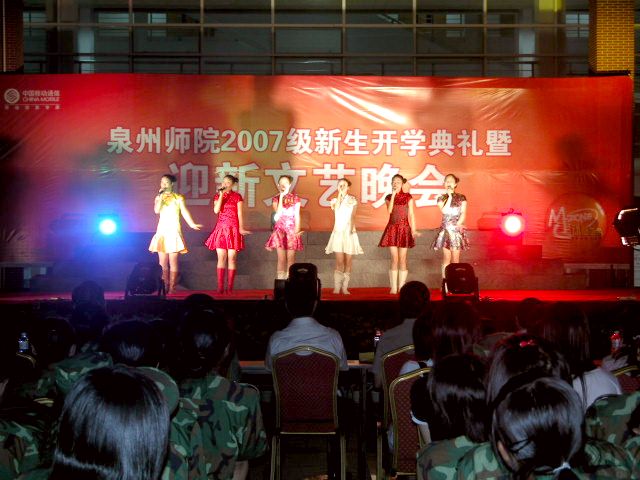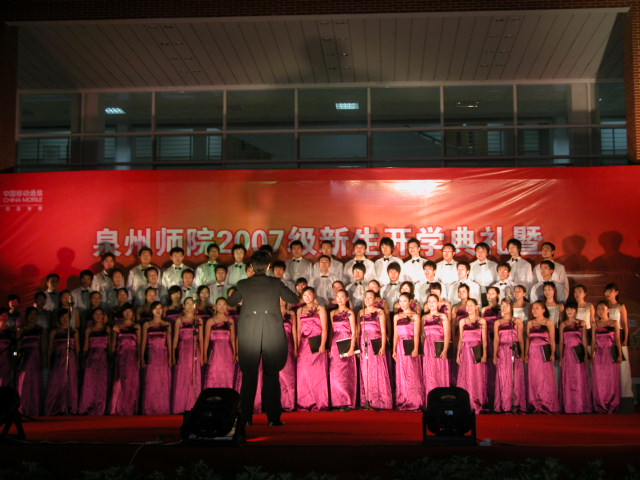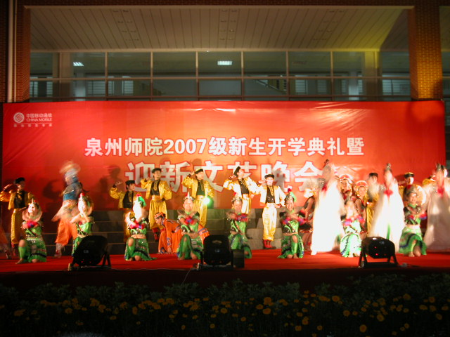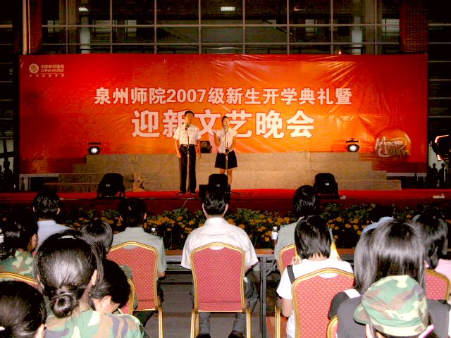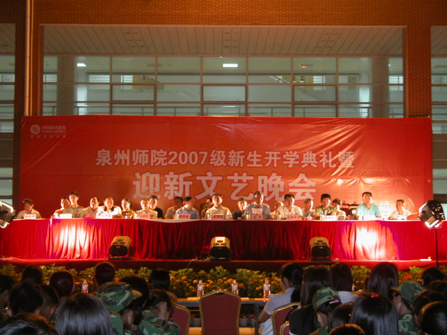 9月28日晚,由校办、党委宣传部、学生处、校团委主办,艺术学院和人文学院承办的泉州师院2007年新生开学典礼暨迎新生文艺晚会在中山广场隆重举行。市人大常委会副主任、校党委书记洪辉煌,校长黄子杰,党委副书记张舟,党委副书记、纪委书记赖新民,副院长王炳庆,副院长林华东,机关各部门负责人、各二级学院院长、分团委负责人,军训团团长,政委以及全体07级新生参加了晚会。开学典礼由张舟主持。