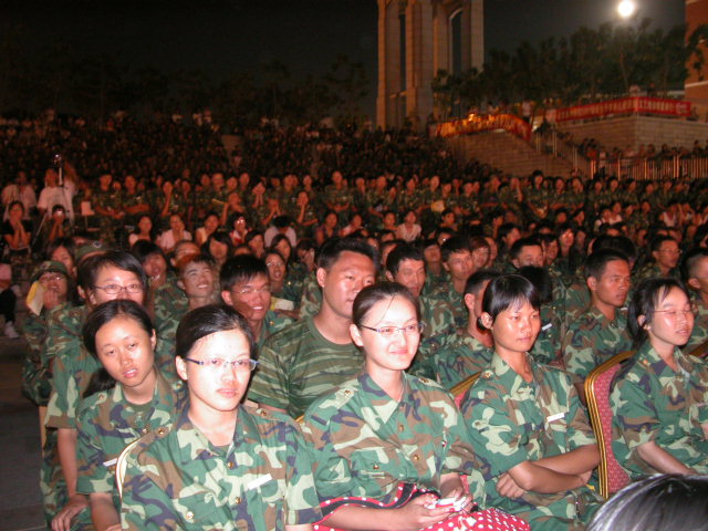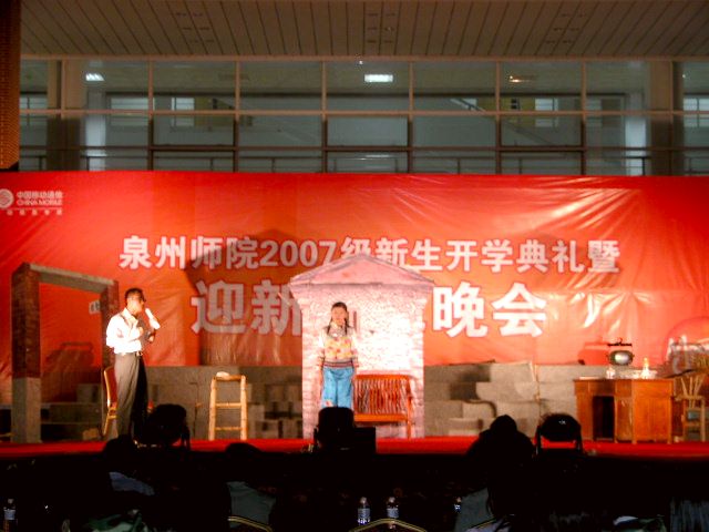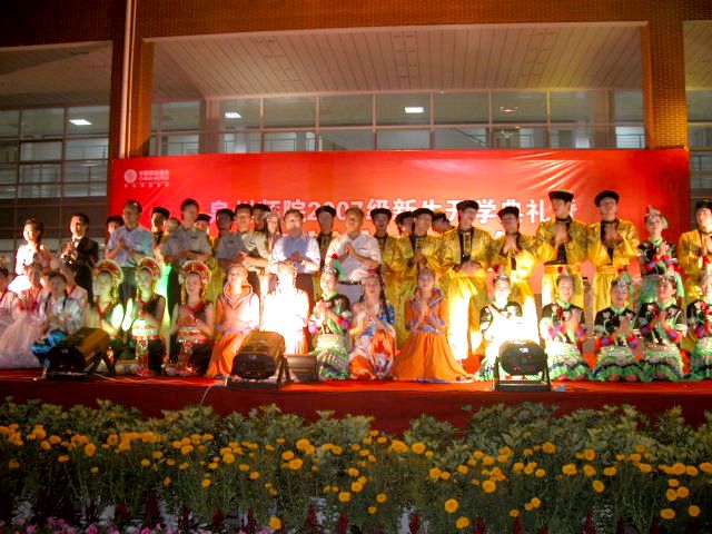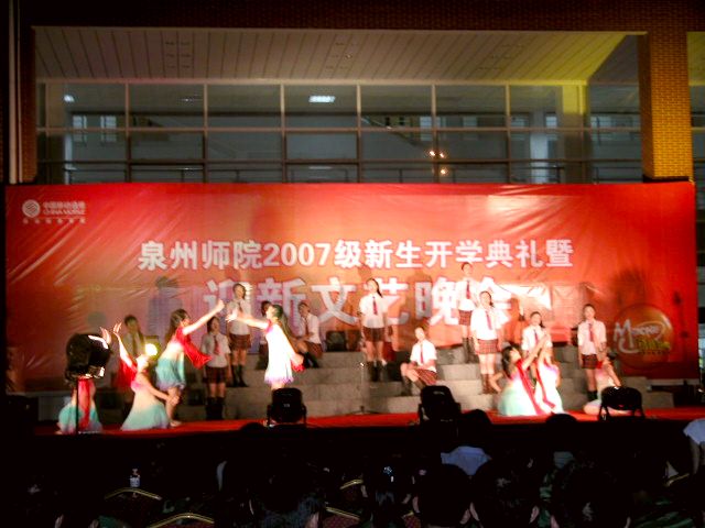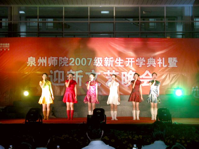 开学典礼结束后举行了迎新文艺晚会。晚会在艺术学院的大合唱《半个月亮爬上来》中拉开帷幕。古色古香的古筝舞蹈《倚秋》、女声小组唱《茶香》和舞蹈《雨中花》为大家展现了一幅幅清新亮丽的诗意画面;校园歌曲联唱《童年》、《同桌的你》等老歌把听众们带进了回忆的时光隧道;相声《历史会考》、小品《天上的红雨》和配乐诗朗诵《大学梦——飞翔》等节目表现了大学生活的五彩缤纷。晚会在舞蹈《响亮节拍》的欢快节奏中圆满地画上句号。晚会结束后,学校领导与晚会演职人员亲切握手并合影留念。