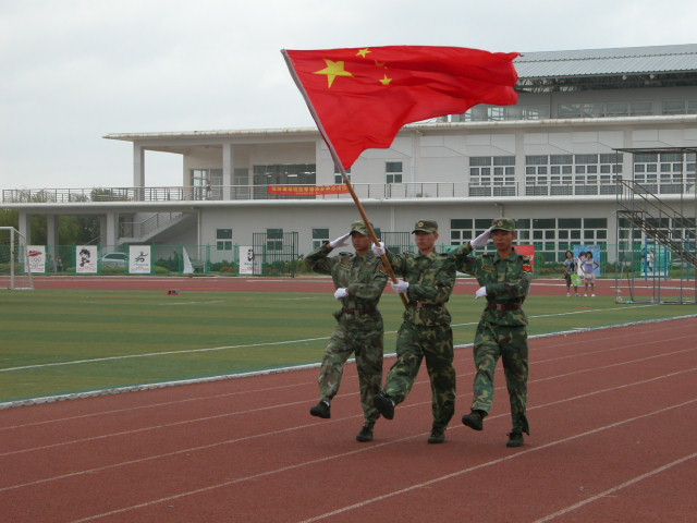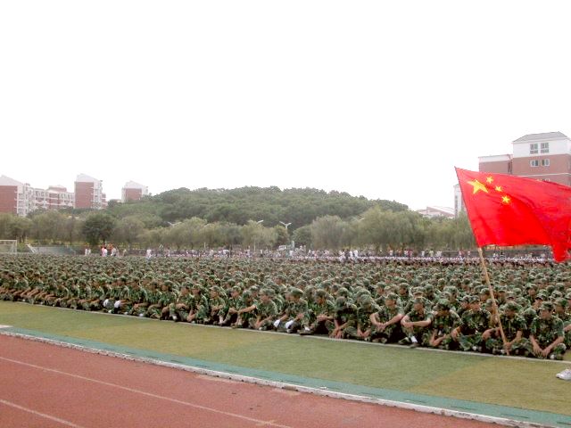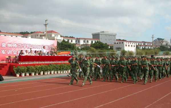 在军训会操仪式中,2007级新生在阅兵式完毕后进行了分列式和军体拳表演,他们的精彩表演赢得阵阵掌声。新生代表和解放军73311部队军训团政委分别上台讲话。