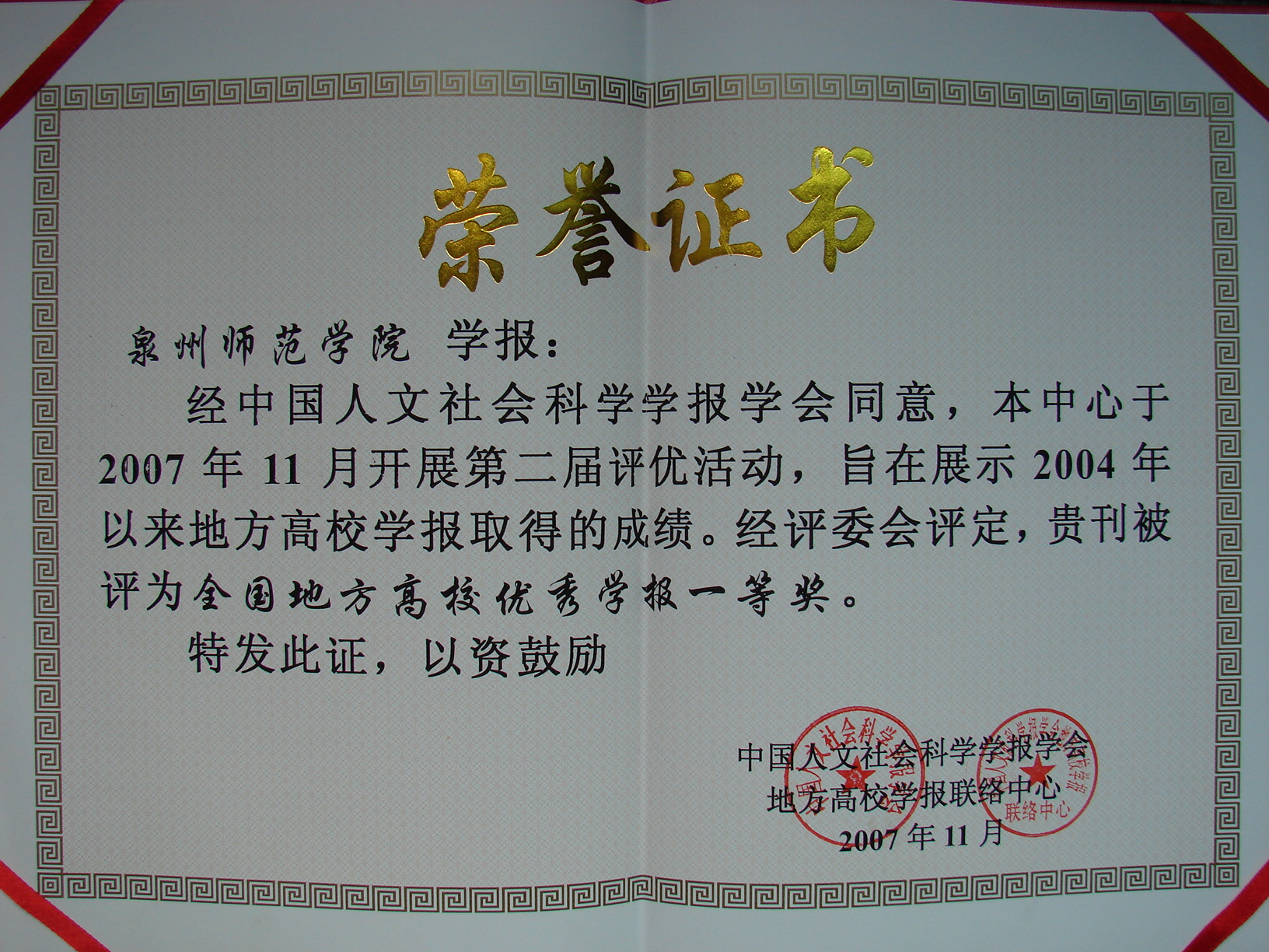 近日,由中国人文社科学报学会全国地方高校学报研究会主办的全国地方高校学报第二届评优活动暨2007年年会落下帷幕。我校学报被评为“全国地方高校优秀学报一等奖”,“泉州学研究”栏目被评为“全国地方高校学报优秀栏目”,林华东同志被评为“全国地方高校学报优秀主编”。