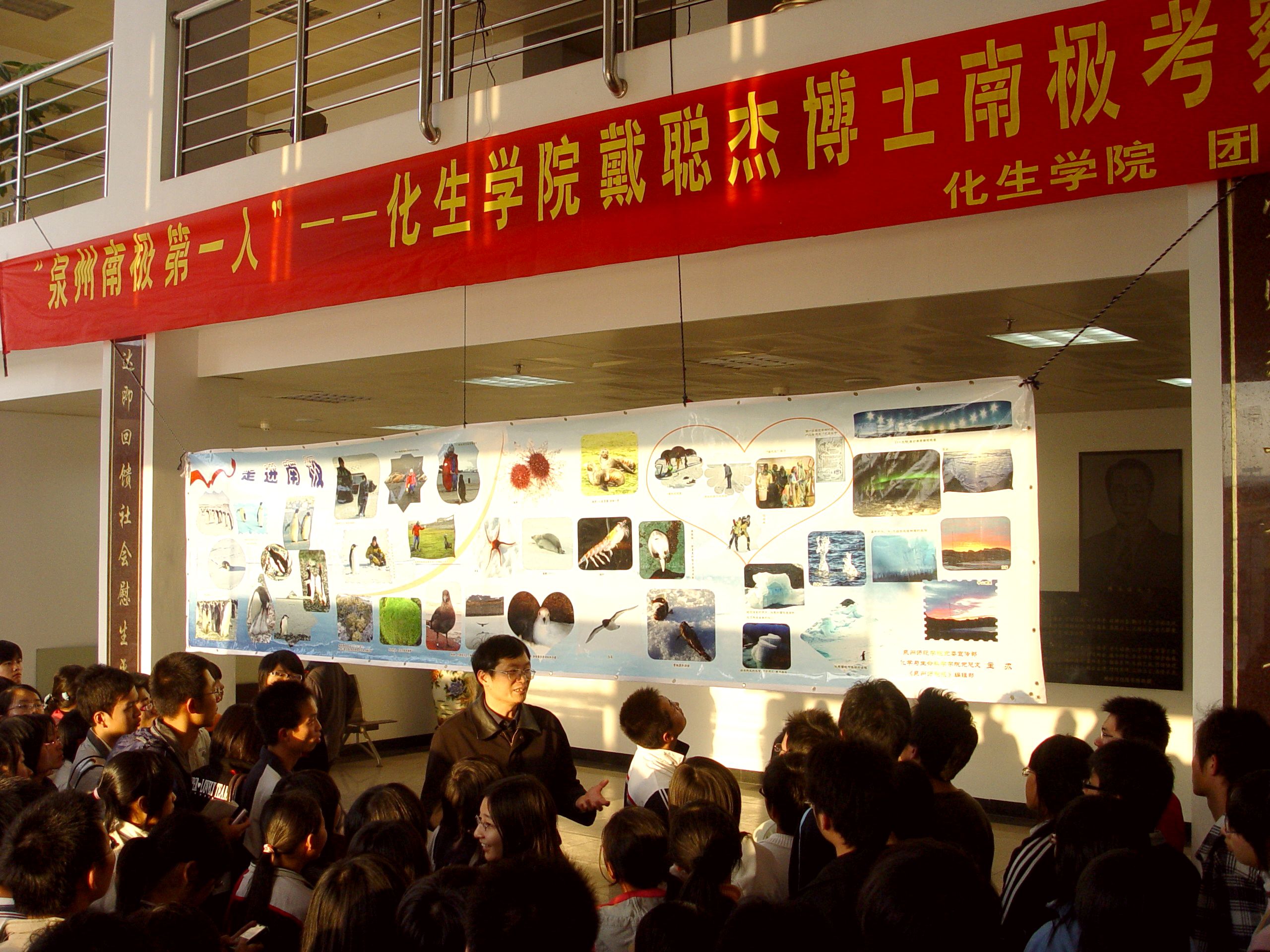 在第十五届校园科技文化艺术节期间,由校党委宣传部、化生学院、《泉州师院报》编辑部联合举办的“走进南极”科技图片展在全校开展。此次图片展分为“走进南极”大型科技图片展、戴聪杰博士现场答疑以及留言南极三个部分。