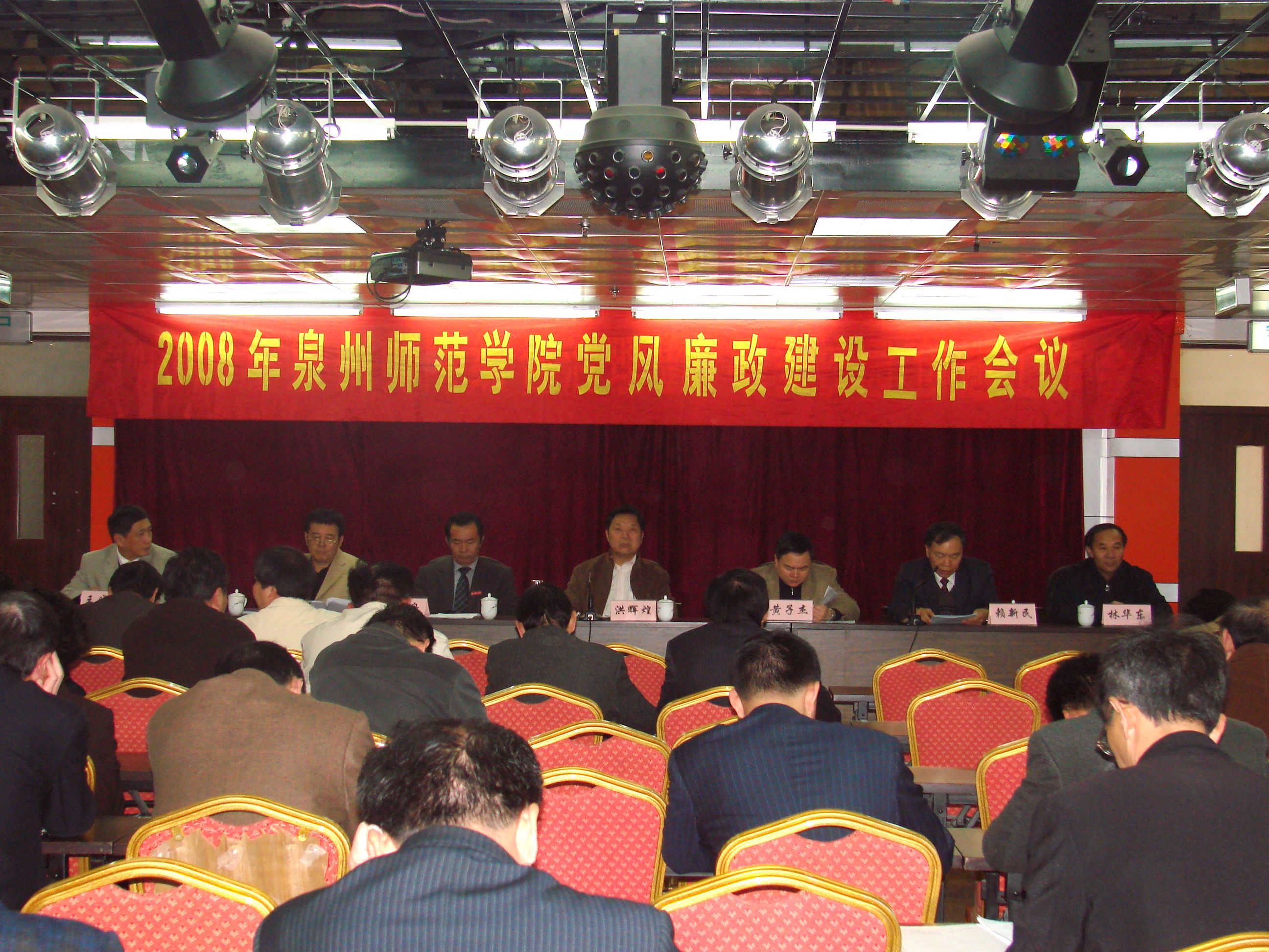 4月3日,2008年泉州师范学院党风廉政建设工作会议在东海校区行政楼大会议室召开。校领导洪辉煌、黄子杰、张舟、赖新民、王炳庆、林华东、王晓东出席了大会。校党委书记洪辉煌在会上作重要讲话,校党委副书记、纪委书记赖新民作工作报告。院长黄子杰主持会议。参加会议的有全校副科级以上干部和校纪委、监审室全体工作人员。