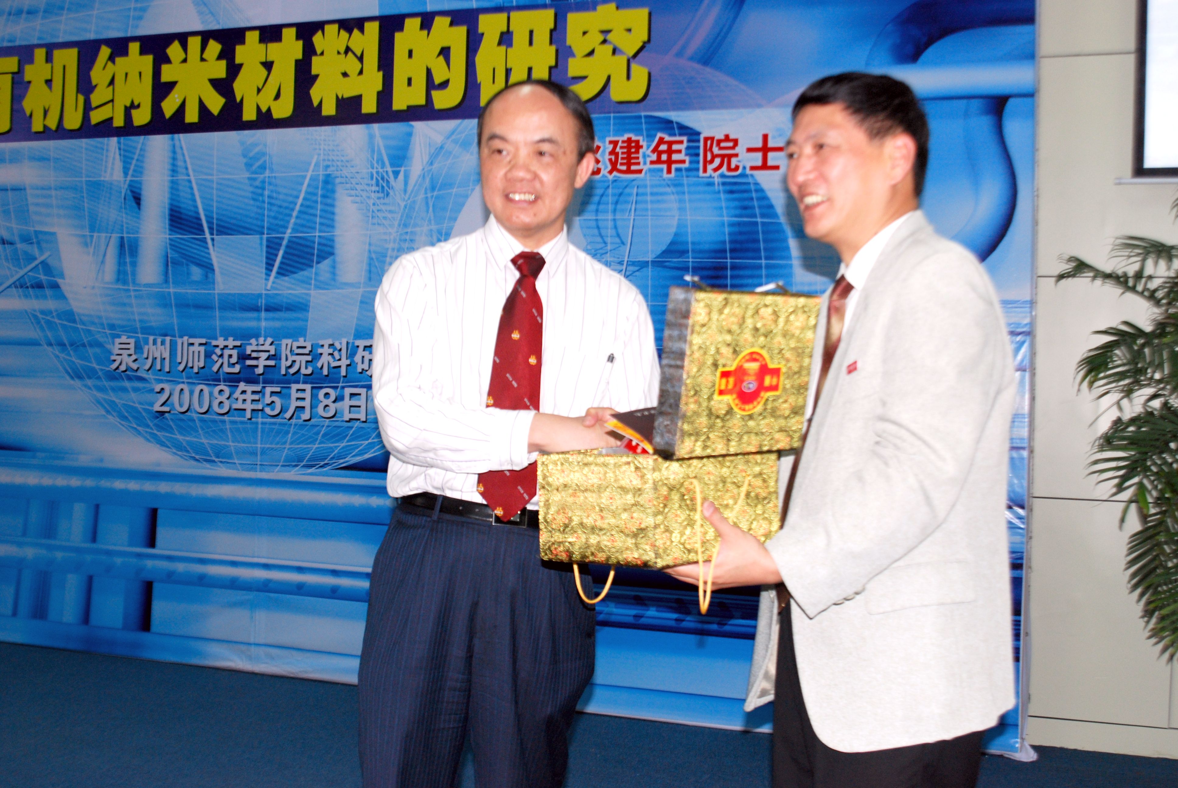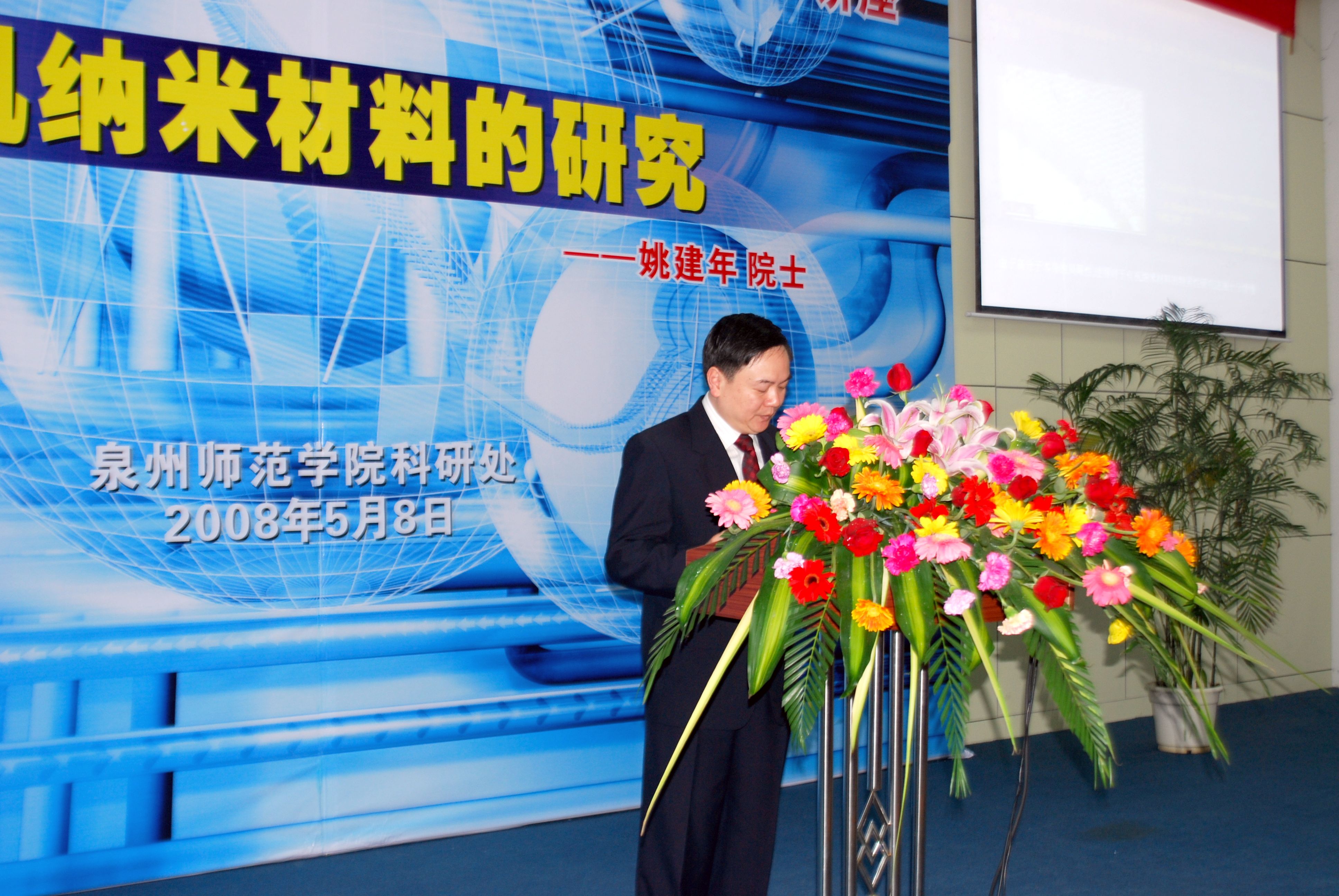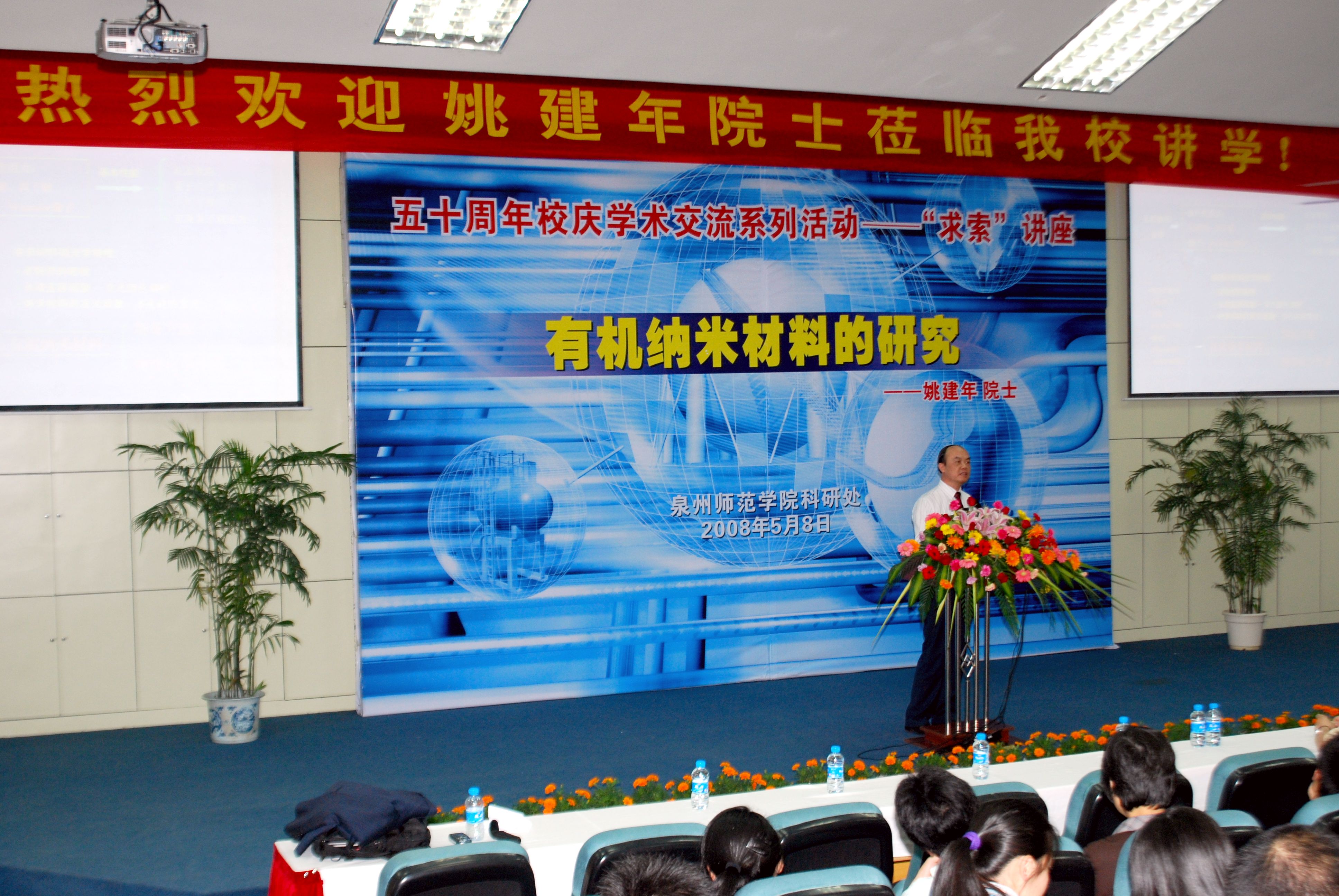 姚建年院士在北大、清华、复旦等大学都做过学术报告,这是第一次回到家乡泉州来做专题学术讲座,他对能参与我校50周年校庆感到十分荣幸,希望本次校庆能成为我校的新起点,并祝愿我校能尽快成为福建省有影响力的高校。姚是光化学与光功能材料领域的代表人物之一,长期从事新型光功能材料的基础和应用探索研究。这次报告主要围绕由他领导的课题组近年来从事的新型有机纳米光功能材料的研究情况对该领域的国际研究进展情况进行概述,并为我校师生生动地介绍了作为一名科学工作者应当如何树立正确的科研理念及投身于研究的坚强意志、如何切实有效地进行研究选题、制定研究方案及把握创新性等要素。报告内容图文并茂、深入浅出。最后的提问阶段,姚院士还与师生们分享自己的学习、生活及科学研究经历。整个报告过程洋溢着科学研究与人生观探索的和谐气氛。