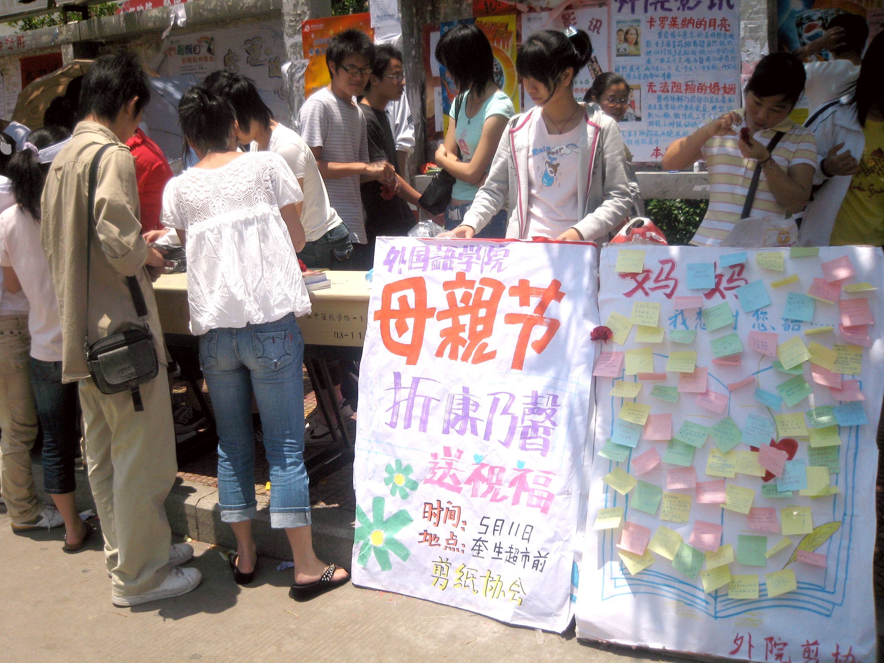 5月10日,在母亲节来临之际,外国语学院及剪纸协会在奎生超市门口举办了“折康乃馨 献祝福”活动。朵朵缤纷的康乃馨,一句句“妈妈我爱您!”“祝天下母亲平安幸福!”等充满感恩母爱的话语,表达了同学们对母亲的感恩之情。