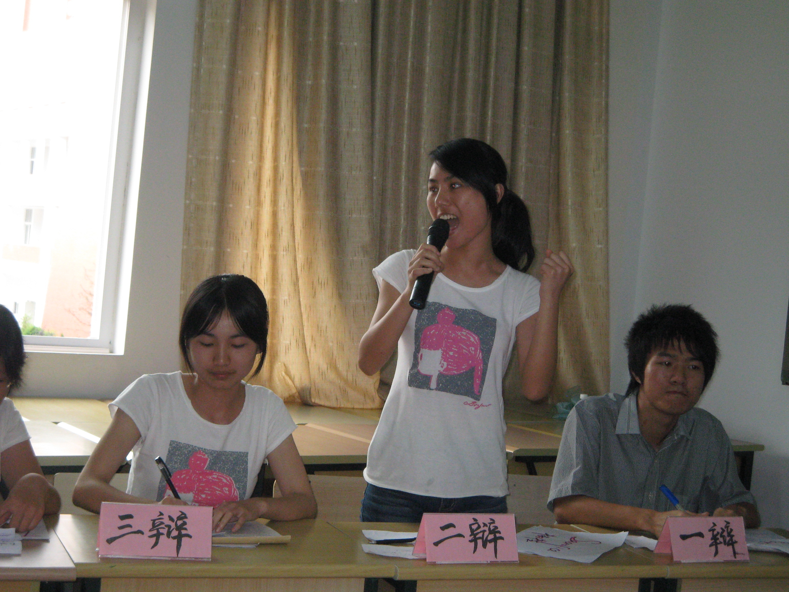 比赛采取一赛制。进入决赛的4队参赛选手分别围绕“Who contribute more to the society, men or women?”和“Experience or education, which is more important?”两个主题展开辩论。由于辩手知识结构、语言处理方面存在一定局限,英语辩论赛难度系数比其他语种的辩论赛要高。正因为如此,辩手们针对辩题进行了精心准备。决赛时,双方用娴熟的口语进行激烈地辩论,特别是在自由辩论阶段,双方辩手引经据典,妙语迭出。辩手们精彩的表现博得观众的阵阵掌声。最后,英语教育队凭着扎实的英语功底、缜密的思维和默契的配合,摘得桂冠。其中,英语教育队的卢丹同学以其出色表现荣获“最佳辩手”称号。(外国语学院)
