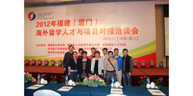 “2012年中国·福建海外人才创业周”活动是由福建省公务员局(省人力资源开发办公室)、福州市人民政府、厦门市人民政府、中国海峡人才市场等共同举办,涉及电子信息、生物医药、装备制造、生态农业、环保与新材料、文化创意与现代服务等多个领域,共有159名海外留学博士与各高校及企业进行了人才和项目的对接洽谈。