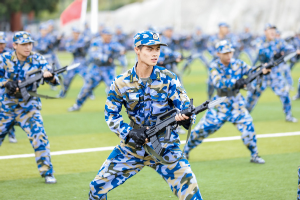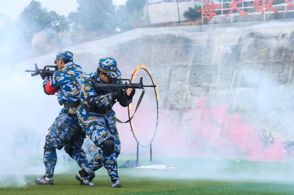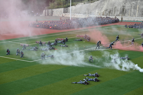 伴随雄壮的国歌声,军训会操拉开帷幕。各方队依次列队,脚踢正步,有序入场。数字方阵、旗语方阵、格斗术方阵、匕首操方阵、刺杀操方阵和战术方阵的学子们依次展开军事科目汇演。