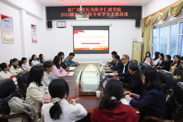 11月27日下午,校长屈广清为陈守仁商学院2023级知识产权专业学生上题为《习近平法治思想的核心要义---深入学习习近平法治思想》思政课。陈守仁商学院党政负责人和辅导员参加。