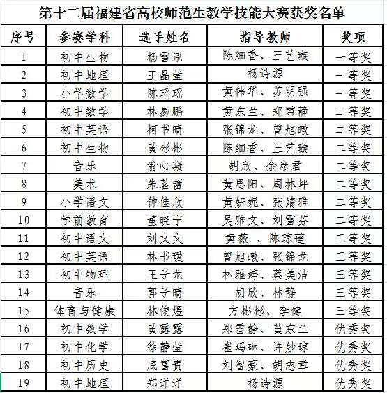 近日,福建省教育厅公布第十二届福建省高校师范生教学技能大赛获奖名单。我校获一等奖3项、二等奖7项、三等奖5项、优秀奖4项,陈细香和杨诗源获评“优秀指导教师”,学校荣获“优秀组织奖”。