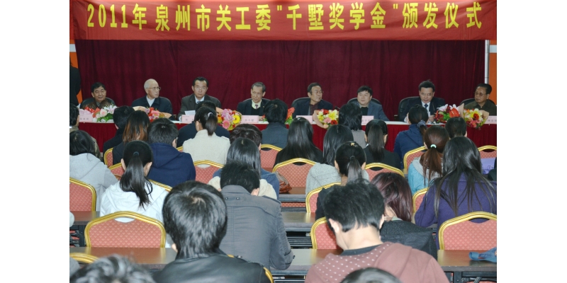 2011年12月9日下午,泉州市关工委第四届千墅奖学金颁发仪式在我校隆重举行。泉州市关工委主任、我校董事会永远荣誉董事长、原泉州市委书记施永康,香港福建社团联会永远名誉主席、我校董事会副董事长苏千墅及泉州市关工委相关领导,校领导黄子杰、张舟、高云程,相关部门负责人、获奖学生和部分学生代表出席会议。会议由校党委副书记张舟主持,副校长高云程宣读了获奖名单。