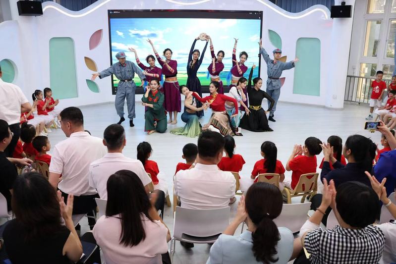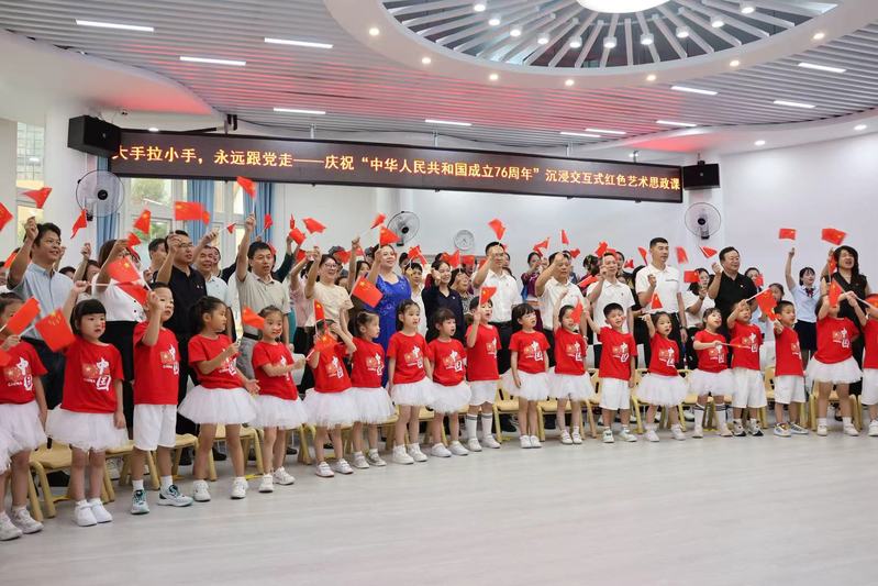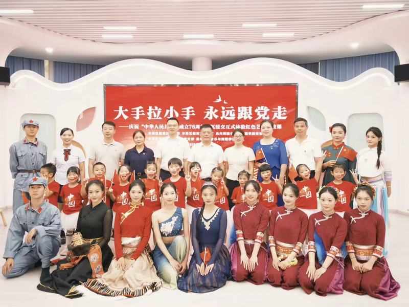 9月29日,在中华人民共和国成立76周年之际,一场以“大手拉小手,永远跟党走”为主题的沉浸交互式体验红色艺术思政课在泉州市丰泽区东海实验幼儿园温情开讲。80余名来自泉州市丰泽区东海片区红色矩阵单位代表、泉州师范学院音乐与舞蹈学院师生及东海实验幼儿园师幼代表齐聚一堂,以艺术为桥,共忆峥嵘、传承红色基因。