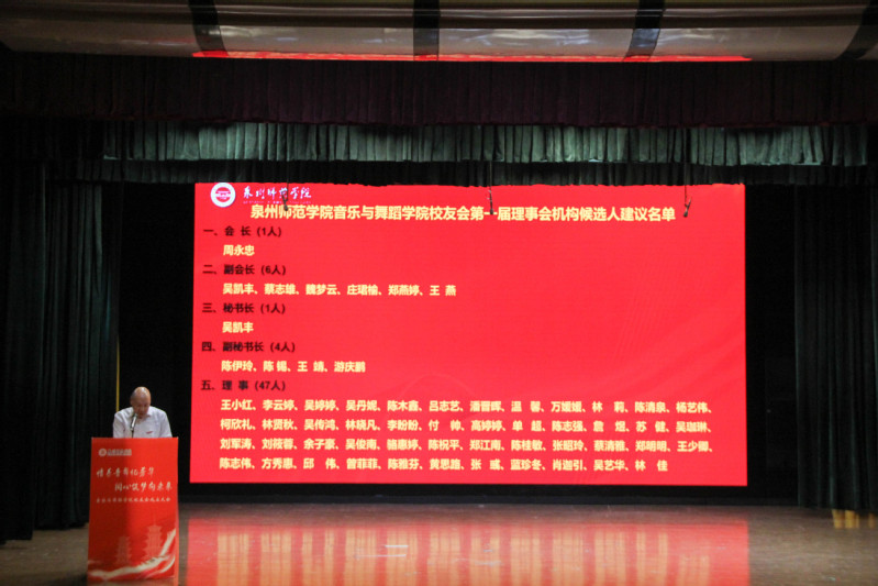 大会审议通过了《泉州师范学院音乐与舞蹈学院校友会章程(草案)》,筹备领导小组组长、学院党委书记苏国柱宣布校友会第一届理事会机构候选人建议名单,大会以等额举手表决的方式通过该名单。