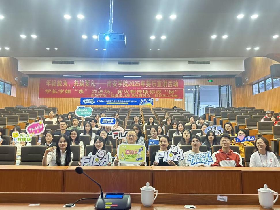10月23日,南安学院举办2026届毕业生校园招聘专场宣讲会。学院党委副书记(主持工作)肖文清、副院长陈丽娥、安踏集团斐乐(FILA)闽赣零售运营大区人力总监潘莹、人力资源经理吴洁、学院和斐乐公司相关人员、以及2026届毕业生100余人参加。本次活动由南安学院“泉材”辅导员工作室承办。