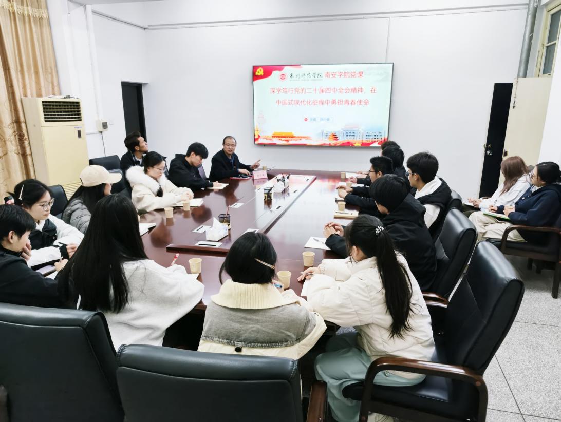 近日,南安校区管委会主任、南安学院副院长(主持工作)洪少春为学生党员、入党积极分子上“深学笃行党的二十届四中全会精神,在中国式现代化征程中勇担大学生使命”专题党课。党课通过理论创新、历史对比与实践指引的三维架构,为青年学子绘就新时代使命担当的行动图谱。