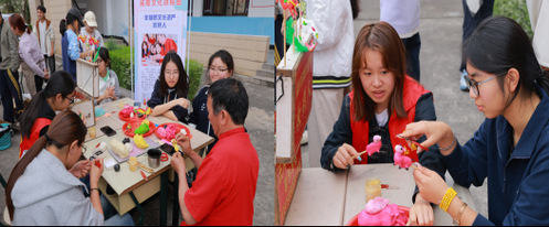在妆糕人制作区,张明铁老师为同学们细致讲解着彩色糯米团的揉捏技巧与造型诀窍,手把手指导大家塑造各式灵动的人物、瑞兽形象。同学们凝神聚力,从揉团、塑形到点缀细节,一步步完成专属的妆糕人作品,指尖的巧思让传统民俗形象焕发出新的活力。