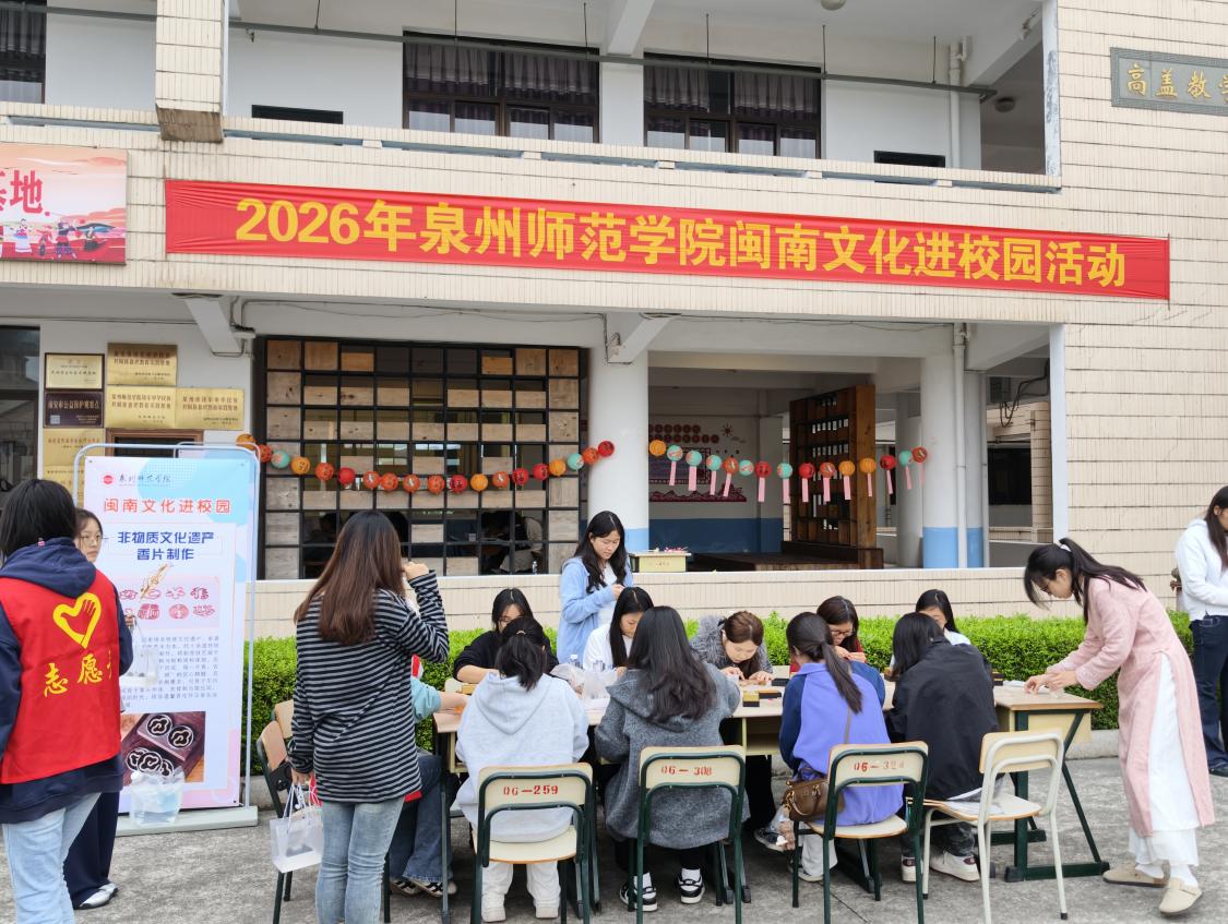 3月26日,由校图书馆、社会科学发展研究中心和世界闽南文化交流研究院联合主办、南安学院承办的“闽南文化进校园”活动在民族工作室前顺利举行。南安学院党委副书记、纪委书记叶世超,妆糕人制作传承人张明铁、糖画制作传承人陈学珍、香片香牌制作传承人刘晓丽、螺钿胸针制作传承人戴雅聪及图书馆张妙霞、陈彬强、张惠萍等七位老师,民族预科班辅导员祖力皮卡尔·艾尔肯以及200余名学生参加此次活动。