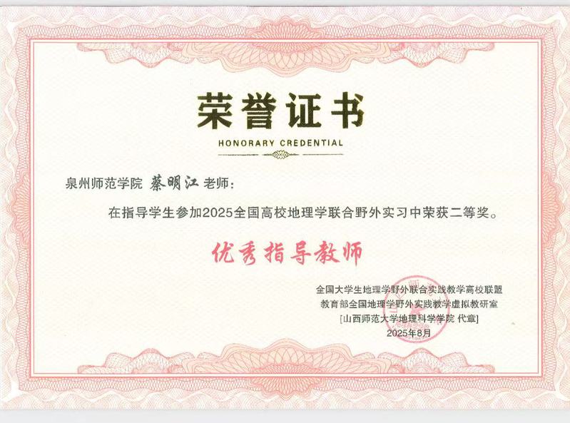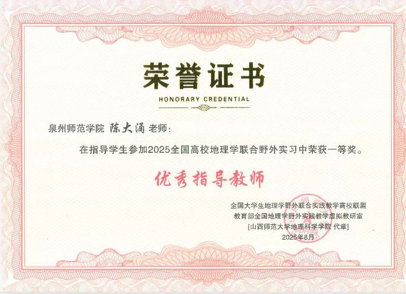 我院陈大涌、蔡明江两位老师在实习期间,积极参与野外考察活动,与同行专家学习交流,带领学生展现泉州师范学院师生风采,取得积极成效,在2025全国高校地理学联合实习中获评优秀指导教师。