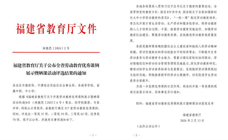 本次全省劳动教育优秀课例展示暨晒课活动经学校推荐、专家评审、网络公示等严格程序开展,旨在深入贯彻落实新时代大中小学劳动教育相关要求,挖掘和推广劳动教育优质教学成果,系统推进全省劳动教育高质量发展。邓秀勤老师的获奖课例扎根泉州海丝文化地域特色,以非遗劳动实践为核心载体,创新采用生成式研学策划教学模式,将文化传承、劳动实践与研学创新深度融合,精准对标学生劳动素养培养要求,探索出跨学科、沉浸式的劳动教育新路径,其教学设计与实施思路具有较强的示范引领作用。