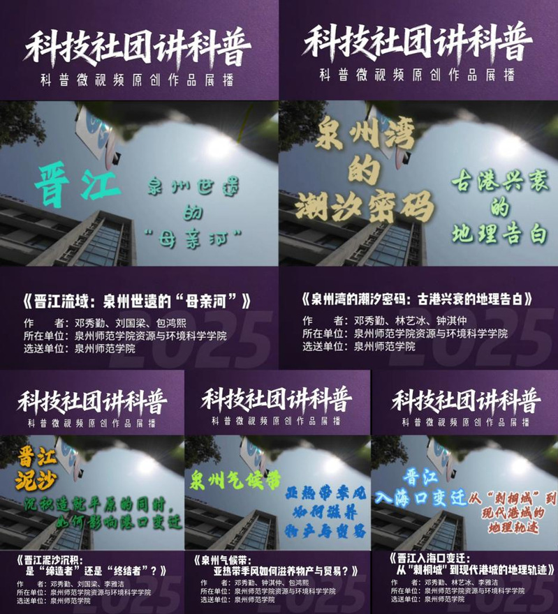 近日,泉州师范学院资源与环境科学学院泉州地理解码小队创作的系列科普微视频《泉州地理密码:解锁世遗保护与“晋江经验”传承之道》,成功入选泉州市“科技社团讲科普”科普微视频原创作品征集展播项目,现已正式在“泉州科普”官方媒体平台上线展播。